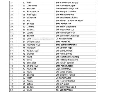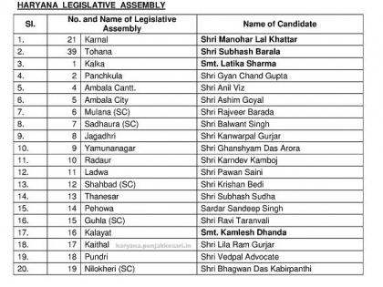 भारतीय जनता पार्टीने आगामी विधानसभा निवडणुकांच्या पार्श्वभूमीवर उमेदवारांची यादी जाहीर केली आहे. महाराष्ट्र आणि हरयाणा येथे विधानसभा निवडणुका पार पडत आहेत. त्यासोबतच विविध राज्यातील एकूण 62 मतदारसंघात पोटनिवडणूक घेण्यात येत आहे. त्या पार्श्वभूमीवर भाजपानेहरयाणातील 78 उमेदवारांची यादी जाहीर केली आहे.