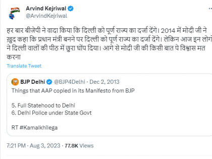 दिल्ली सेवा विधेयक लोकसभेत मंजूर होताच अरविंद केजरीवाल यांनी ट्विट करत भाजपवर हल्ला चढवला. त्यांनी दिल्ली भाजपच्या 2013 च्या ट्विटचा हवाला दिला, ज्यामध्ये भाजपने दावा केला होता की, आम आदमी पार्टीने त्यांच्या जाहीरनाम्यातील आश्वासनांची कॉपी केली आहे. दिल्लीला पूर्ण राज्याचा दर्जा देणे आणि दिल्ली पोलिसांना दिल्ली सरकारच्या अखत्यारीत आणणे, ही आश्वासने होती. दिल्ली भाजपच्या ट्विटचा हवाला देत केजरीवाल यांनी लिहिले की, भाजपने प्रत्येक वेळी दिल्लीला पूर्ण राज्याचा दर्जा देण्याचे आश्वासन दिले. 2014 मध्ये मोदींनी स्वतः पंतप्रधान झाल्यावर दिल्लीला पूर्ण राज्याचा दर्जा देऊ, असे म्हटले होते. पण आज या लोकांनी दिल्लीतील जनतेच्या पाठीत खंजीर खुपसला. आता मोदींच्या कोणत्याही गोष्टीवर विश्वास ठेवू नका, असं केजरीवाल म्हणाले.
