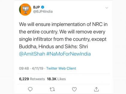 लोकसभा निववडणुकीवेळी प्रचार करताना एप्रिल महिन्यात अमित शहांनी एका भाषणादरम्यान राष्ट्रीय नागरिकत्व नोंदणीवर भाष्य केलं होतं. आम्ही संपूर्ण देशात राष्ट्रीय नागरिकत्व नोंदणी लागू करू असं अमित शहा म्हणाले होते. मात्र याच विषयावर बोलताना त्यांनी एक केलेलं विधान वादग्रस्त ठरलं. बौद्ध, हिंदू आणि शीख यांचा अपवाद वगळता आम्ही सगळ्या घुसखोरांची देशातून हकालपट्टी करू, असं शहा म्हणाले होते. त्यांचं हे विधान भाजपानं ट्विटदेखील केलं होतं. मात्र कालच भाजपानं हे ट्विट डिलीट केलं. सध्या या ट्विटचे स्क्रीनशॉट्स मोठ्या प्रमाणात व्हायरल झाले आहेत.