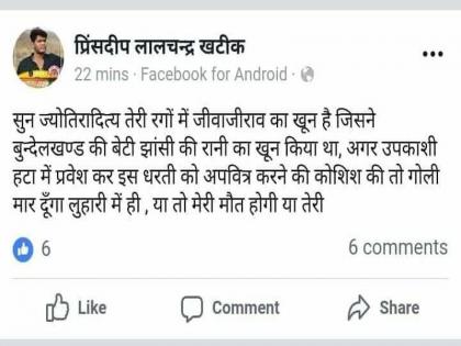 बुंदेलखंडच्या झाशीच्या राणीचा ज्याने खून केला त्या जिवाजी रावचे तुझ्या अंगात रक्त आहे, जर तू हटा मध्ये प्रवेश करत उपकाशीला अपवित्र करण्याचा प्रयत्न केलास तर गोळी झाडेन, एकतर तुझा मृत्यू नाहीतर माझा मृत्यू होईल, अशा शब्दांत प्रिंसदीप याने सोशल मिडियावर पोस्ट टाकली आहे,