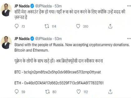 नवी दिल्ली - भारतीय जनता पक्षाचे राष्ट्रीय अध्यक्ष जेपी नड्डा यांचे ट्विटर अकाउंट हॅक झाले आहे. हॅकरने अकाउंट हॅक केल्यानंतर सॉरी, असेही लिहिले आहे. ही माहिती समोर आल्यानंतर, त्यांच्या ट्विटर हँडलवरून, ''सॉरी माझे अकाउंट हॅक झाले आहे. येथे रशियाला दान करण्यासाठी कारण त्यांना मदतीची आवश्यकता आहे,'' अशी पोस्ट करण्यात आली आहे.