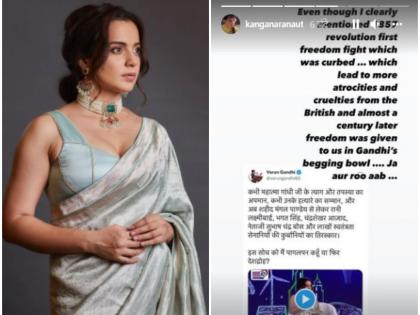 कंगना रणौत पुन्हा एकदा तिच्या वक्तव्यामुळे चर्चेत आली आहे. देशाला स्वातंत्र्य भिकेत मिळाले, या तिच्या वक्तव्यावर वरुण गांधी यांनी ट्विट करून नाराजी व्यक्त केली होती. वरुण यांचे हे ट्विट कंगनाने इंस्टाग्रामवर शेअर करत लिहिले, 'मी स्पष्टपणे बोलले होते, की 1857 ची क्रांती नियंत्रित करण्यात आली होती. यामुळे ब्रिटीश शासनाकडून अधिक अत्याचार आणि क्रूरता केली गेली आणि जवळपास शतकानंतर आपल्याला स्वातंत्र्य दिले गेले, तिही गांधींच्या भिकेत. जा आता आणखी रडा.'