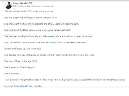 "तिनं २०१३ साली आपल्या पतीला गमावलं. त्यावेळी आईचं वय ४४ वर्ष होतं. २०१९ साली तिला स्टेज-३ ब्रेस्ट कॅन्सर झाला. त्यानंतर दोन वर्ष तिनं केमोथेरेपी घेतली. कॅन्सरवरही तिनं मात केली. कॅन्सरवर उपचार घेत असताना तिला कोरोनाची लागण झाली. यात ती नैराश्यात गेली. नैराश्य आणि कोरोना या दोघांचा तिनं सामना केला. पण हार अजिबात मानली नाही. वयाच्या ५२ व्या वर्षी ती पुन्हा एकदा प्रेमात पडली. तिनं लग्न केलं. ती एक फायटर आहे आणि माझी आई आहे", असं जिमीत गांधीनं त्याच्या पोस्टमध्ये म्हटलं आहे.