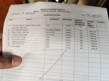 बिपिन रावत आणि त्यांच्या पत्नी मधुलिका यांच्यासोबत लष्कराचे वरिष्ठ अधिकारी होते. ब्रिगेडियर एल. एस. लिड्डर, लेफ्टनंट कर्नल हरजिंदर सिंग, नायक गुरुसेवक सिंग, नायक जितेंद्र कुमार, लान्स नायक विवेक कुमार, लान्स नायक साई तेजा आणि हवालदार सत्पाल अपघातावेळी हेलिकॉप्टरमध्ये होते. बिपिन रावत आणि मधुलिका रावत यांना रुग्णालयात दाखल करण्यात आली असून त्यांची प्रकृती गंभीर असल्याची माहिती मिळत आहे.