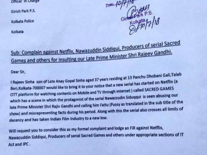 पश्चिम बंगालच्या एका कॉंग्रेस कार्यकर्त्याने यासंबधी पोलिसांत तक्रार दाखल केली आहे. राजीव सिन्हा असे या कॉंग्रेस कार्यकर्त्याचे नाव आहे. राजीव सिन्हा यांनी Sacred Games च्या एका भागात राजीव गांधी यांना फट्टू हा शब्द वापरला असल्याचे म्हटले आहे. तसेच, याचे इंग्रजी सबटायटलमध्येही आक्षेपार्ह असे अनुवादन केले आहे, असे सांगत त्यांनी अभिनेता नवाजुद्दीन सिद्दीकी आणि वेब सिरिजच्या निर्मात्यांवर एफआयआर दाखल करण्याची मागणी केली आहे.