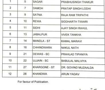 त्यासोबतच अजयसिंह राहू यांना सीधी मतदारसंघातून तर अरुण यादव यांना खंडवा मतदारसंघातून उमेदवारी देण्यात आली आहे. काँग्रेसने प्रसिद्ध केलेल्या उमेदवारी यादीतील उमेदवारांची नावे पुढील प्रमाणे आहेत.