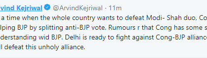 काँग्रेसकडून आघाडी न झाल्याने आप नेते अरविंद केजरीवाल यांनी काँग्रेसवर जोरदार हल्ला चढविला. अरविंद केजरीवाल यांनी टिविट् करत संपुर्ण देश मोदी-शहा यांच्या जोडीला हरविण्यासाठी एकत्र येत असताना अशावेळी भाजपविरोधी मतांमध्ये फूट पाडण्याचे काम करून एकप्रकारे काँग्रेस भाजपला मदत करत असल्याचे सांगितले. तसेच भाजप-काँग्रेसची छुपी युती झाली असल्याची अफवाही पसरत आहेत असा टोलाही लगावला. दिल्लीत भाजप-काँग्रेसच्या अनैतिक युतीशी लढण्यास आम्ही तयार आहोत, जनताही अशा अनैतिक युतीला हरवणार आहे.