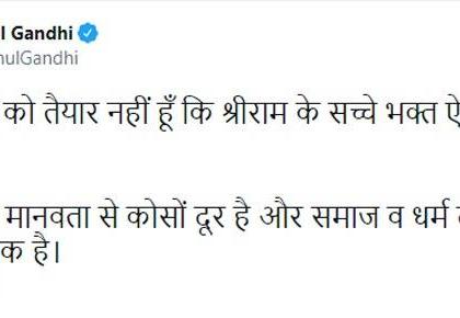 मी हे मान्य करायला तयार नाही की, श्रीरामांचे खरे भक्त असे करु शकतात, अशी क्रौर्यता माणुसकीपासून दूर आहे आणि ती समाज आणि धर्म या दोघांसाठीही लाजिरवाणी आहे, असे राहुल गांधी यांनी ट्विटमध्ये म्हटले आहे. त्यापूर्वी प्रभू श्रीराम हे स्वत: न्याय आहेत, सत्य आहेत, धर्म आहेत. त्यांच्या नावाने धोकेबाजी हा अधर्म आहे, असे राहुल गांधींनी म्हटले होते.