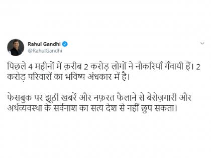 राहुल गांधी यांनी "4 महिन्यांत गेल्या 2 कोटी लोकांच्या नोकऱ्या, 2 कोटी कुटुंबांचं भविष्य अंधारात" असल्याचं म्हटलं आहे. आपल्या ट्विटर अकाऊंटवरून त्यांनी मोदी सरकारवर जोरदार टीका केली आहे. "गेल्या 4 महिन्यांत जवळपास 2 कोटी लोकांच्या नोकऱ्या गेल्या, 2 कोटी कुटुंबांचं भविष्य अंधारात आहे. फेसबुकवर खोट्या बातम्या आणि द्वेष पसरवून बेरोजगारी आणि अर्थव्यवस्थेच्या सर्वनाशाचे सत्य देशापासून लपवता येत नाही" असं राहुल गांधी यांनी म्हटलं आहे.