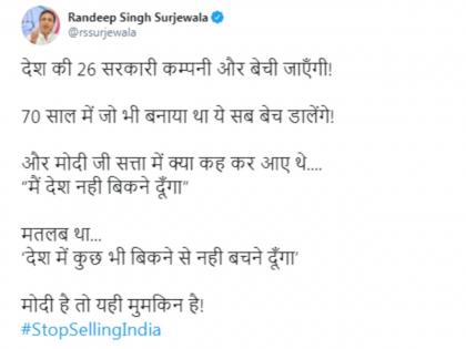 काँग्रेसचे राष्ट्रीय प्रवक्ते रणदीप सुरजेवाला यांनी आपल्या ट्विटर अकाऊंटवरून सोमवारी (7 सप्टेंबर) याबाबत एक ट्विट केलं आहे. '७० वर्षांत जे काही उभं केलं होतं, ते सगळं हे विकून टाकणार' असं म्हणत भाजपावर हल्लाबोल केला आहे. "देशाच्या आणखी २६ सरकारी कंपन्या विकल्या जाणार आहे. ७० वर्षांत जे काही उभं केलं होतं, ते सगळं हे विकून टाकणार. मोदीजी काय सांगून सत्तेत आले होते ‘मैं देश नही बिकने दूँगा’ त्याचा अर्थ होता देशातील काही विक्री होण्यापासून सोडणार नाही. मोदी है तो यही मुमकिन है" असं सुरजेवाला यांनी म्हटलं आहे.