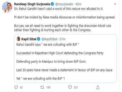 कपिल सिब्बल यांचे हेच ट्विट रिट्विट करत काँग्रेस प्रवक्ता रणदीप सिंह सुरजेवाला यांनी म्हटले आहे, की माध्यमांत राहुल गांधींसंदर्भात जे बोलले जात आहे, ते राहुल गांधी यांनी म्हटलेले नाही. सुरजेवाला यांनी ट्विटमध्ये म्हटले आहे, की ''राहुल गांधी यांनी, असे काहीही म्हटलेले नाही. यासंदर्भात कुठलीही चर्चा झालेली नाही. कृपया माध्यमांवरील खोट्या बातम्यांमुळे गैरसमज निर्माण होऊ देऊ नका अथवा चुकीची माहितीही पसरवू नका. मात्र हो, आपसात लढत बसण्याऐवजी क्रूर मोदी सरकारविरुद्ध एकजुटीने लढणे अधिक आवश्यक आहे.