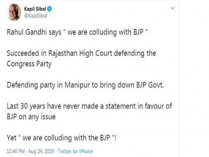कपील सिब्बल यांनी ट्विट केले आहे, की "आम्ही भाजपाशी हातमिळवणी केली, असे राहुल गांधी म्हणतात. राजस्थान उच्च न्यायालयात पक्षाची बाजू यशस्वीपणे मांडली. मणीपूरमध्ये भाजपा सरकारविरोधात पक्षाची बाजू मांडली. गेल्या 30 वर्षांत भाजपाच्या पथ्यावर पडेल, असे एकही विधाम केले नाही. तरी आम्ही भाजपाशी हातमिळवणी केल्याचे म्हटले जाते,' अशा शब्दांत सिब्बल यांनी आपली नाराजी व्यक्त करत राहुल गांधी यांना सुनावले आहे.