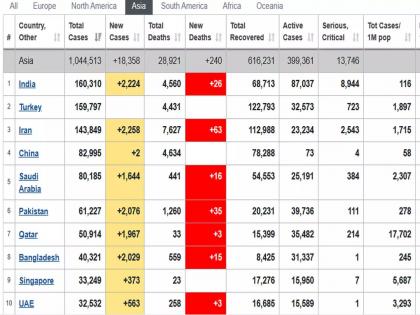 नवी दिल्ली: देशात लॉकडाऊनचा चौथा टप्पा सुरू असूनही कोरोना बाधितांचा आकडा सातत्यानं वाढत आहे. देशातील कोरोना रुग्णांची संख्या १ लाख ६० हजारांच्या पुढे गेली आहे. यामुळे भारताच्या नावावर एक नकोसा विक्रम नोंदला गेला आहे. आशियातील देशांचा विचार केल्यास कोरोनाबाधितांच्या संख्येत भारत पहिल्या क्रमांकावर पोहोचला आहे. सध्या जगातील केवळ आठच देशांमधील कोरोना रुग्णांचा आकडा भारतापेक्षा जास्त आहे.