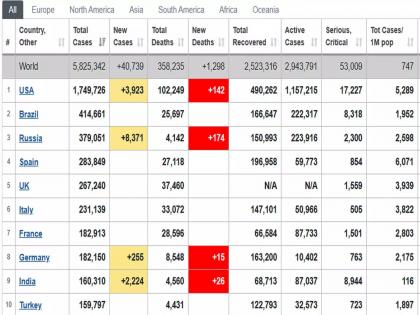 worldometers.info हे संकेतस्थळ जगभरातल्या कोरोनाबाधितांची आकडेवारी देतं. भारतात सध्याच्या घडीला कोरोनाचे १ लाख ६० हजार ३१० रुग्ण आहेत. आशिया खंडात इतकी रुग्णसंख्या कोणत्याही देशात नाही. मात्र केंद्रीय आरोग्य मंत्रालयानं आतापर्यंत १ लाख ५८ हजार ३३३ रुग्ण सापडल्याची माहिती दिली आहे. यातील ६७ हजार ६९१ जण बरे झाले असून ४ हजार ५३१ जणांचा मृत्यू झाल्याची आकडेवारी मंत्रालयानं दिली.