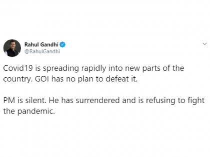 "कोरोना व्हायरस देशाच्या नव्या भागांत अत्यंत वेगाने पसरत आहे. कोरोनाचा सामना करण्यासाठी, त्याविरोधात लढण्यासाठी मोदी सरकारकडे कोणतीही योजना नाही. पंतप्रधान नरेंद्र मोदी शांत बसले आहेत. त्यांनी या रोगापुढे आणि त्याच्या वाढत्या प्रादुर्भावापुढे सरेंडर केलं आहे" असाही आरोप राहुल गांधी यांनी केला आहे. आपल्या ट्विटर अकाऊंटवरून त्यांनी मोदी सरकारवर जोरदार टीका केली आहे.
