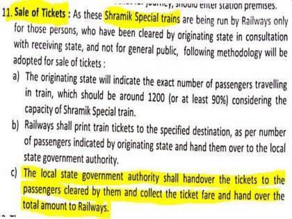 ज्या राज्यांमध्ये विशेष ट्रेन सोडल्या जाणार आहेत, त्या राज्यांनी मजुरांची यादी रेल्वेला द्यावी. त्याप्रमाणे रेल्वेकडून तिकीटं छापली जातील. त्यानंतर राज्य सरकारांना रेल्वेकडून तिकीटं दिली जातील. राज्य सरकारांनी स्थानिक प्रशासनाच्या माध्यमातून तिकीटं मजुरांना द्यावीत आणि त्यांच्याकडून आलेलं तिकीट भाडं रेल्वेकडे जमा करावं, असा मजकूर रेल्वेच्या पत्रात आहे.