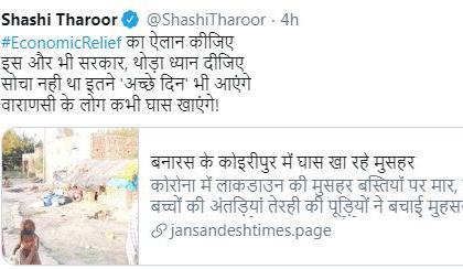 काँग्रेस नेते शशी थरुर यांनी या संदर्भातील बातमी आपल्या ट्विटर अकाऊंटवरुन शेअर केली आहे. तसेच, आर्थिक पॅकेज जाहीर करण्याची मागणीही केली. विशेष म्हणजे थरुर यांच्या मागणीनंतर काही तासातच अर्थमंत्री निर्मला सितारमण यांनी पत्रकार परिषद घेऊन आर्थिक पॅकेज जाहीर केलं आहे. थरुर यांनी वारणसीतील विदारक परिस्थिती मांडत, मोदी सरकारवर टीका केली. सोचा नही था इतने अच्छे दिन आयेंगे, वाराणसी के लोग भी घास खायेंगे, असे ट्विट थरुर यांनी केले आहे.