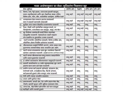 >रेड झोन : जीवनावश्यक वस्तू व औषध वाहतुकीला परवानगी. सायकल रिक्षा, आॅटो रिक्षा, खासगी टॅक्सीसह ओला, उबरला परवानगी नाही. खासगी वाहनातून चालकासह दोघांना परवानगी. दुचाकीवर एकच जण. विशेष आर्थिक क्षेत्रातील उद्योग, वैद्यकीय उपकरणे, औषध निर्माण व ई-कॉमर्सवरून जीवनावश्यक वस्तू तसेच खासगी कार्यालयांत ३३ टक्के कर्मचाºयांना परवानगी.