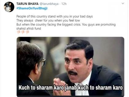 भज्जी आणि युवी यांनी शाहिद आफ्रिदी करत असलेल्या समाजकार्यात हातभार लावण्याचं आवाहनही लोकांना केलं आहे. त्यामुळेच, नेटीझन्स युवी अन् भज्जीवर संतापले आहेत