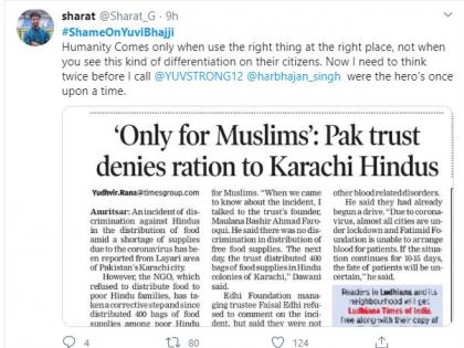 भज्जी आणि युवी यांनी शाहिद आफ्रिदी करत असलेल्या समाजकार्यात हातभार लावण्याचं आवाहनही लोकांना केलं आहे. त्यामुळेच, नेटीझन्स युवी अन् भज्जीवर संतापले आहेत. कोरोना व्हायरससाठी जगभरातून मदतीचा ओघ येत आहे. विविध क्षेत्रातील सेलिब्रेटी आपापल्या परीनं या समाजकार्यात हातभार लावताना दिसत आहेत. शाहिद आफ्रिदीच्या फाऊंडेशननं आतापर्यंत पाकिस्तानातील दोनशेहून अधिक गरजूंना जीवनावश्यक वस्तू पुरवण्याचं काम केलं आहे. त्याच्या या समाजकार्याचं भज्जी आणि युवी यांनी कौतुक केलं आहे.