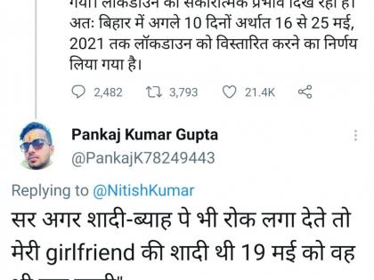 दरम्यान, लॉकडाऊन वाढवण्याच्या मुख्यमंत्र्यांच्या निर्णयानंतर एका तरुणाने ट्विटरवर मुख्यमंत्र्यांना उद्देशून ट्विट केले आहे. पंकजकुमार गुप्ता असे या तरुणाचे नाव असून, केलेल्या ट्विटमध्ये तो म्हणतो की, सर जर तुम्ही लग्न विवाहांनाही बंदी घातली असती तर १९ मे रोजी होणारा माझ्या गर्लफ्रेंडचा विवाह थांबला असता. त्यासाठी मी तुमचा जन्मभर ऋणी राहीन. दरम्यान, या तरुणाने केलेल्या या मागणीची ट्विटरवर खूप चर्चा सुरू आहे.