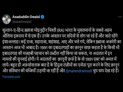 ओवेसी म्हणाले की, "1991 चा प्रार्थनास्थळ कायदा स्पष्टपणे सांगतो की, कुठल्याही प्रार्थनास्थळाची धार्मिक ओळख बदलसी जाऊ शकत नाही. तसेच, हिंदुत्ववादी संघटनांचा अजेंडा पूर्ण करण्यासाठी कायदा आणि संविधानाचे उल्लंघन केले जात असून पंतप्रधान नरेंद्र मोदी यावर मौन बाळगून आहेत, असा आरोपही ओवेसी यांनी केला आहे.