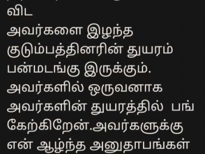 या घटनेची कमल हासननेही पुष्टी केली असून त्याने दुःख व्यक्त केले आहे. आज झालेला अपघात हा माझ्या करियरमधील कधी न पाहिलेला भीषण अपघात होता. मी माझे तीन सहकारी गमावले. पण त्याहून मोठे दुःख त्यांच्या नातेवाईकांचे वाटते. असे ट्विट हसन यांनी केले आहे.