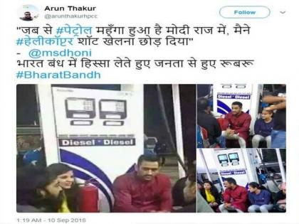 नवी दिल्ली: इंधन दरवाढीविरोधात काल काँग्रेसनं भारत बंद पुकारला होता. काँग्रेसच्या या बंदला 21 पक्षांनी पाठिंबा दिला होता. या पार्श्वभूमीवर आता भारतीय संघाचा माजी कर्णधार महेंद्रसिंह धोनीचापेट्रोल पंपावरील फोटो व्हायरल झाला आहे. या फोटोत धोनीसोबत त्याची पत्नी साक्षीदेखील दिसत आहे. धोनीनंदेखील भारत बंदमध्ये सहभाग घेतला होता, असा दावा केला जात असून हा फोटो मोठ्या प्रमाणात सोशल मीडियावर शेअर होत आहे.