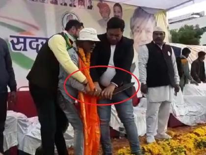 अचानक एक व्यक्ती स्टेजवर पोहोचला. स्टेजवर आल्यानंतर त्याने माईकवरून जय श्री रामच्या घोषणा दिल्या. यावेळी काँग्रेस कार्यकर्त्यांनी त्याची अडवणूक करत माईक बंद केला. संतापलेल्या आरोपीने अचानक आपल्या जवळील चाकू काढला. तसेच जय श्री राम न बोलल्यास जीवे मारण्याची धमकी दिली. यानंतर मंचावर एकच गोंधळ उडाला. दरम्यान काँग्रेस नेते प्रभात साहनी यांच्यासह अन्य कार्यकर्त्यांनी संबंधित तरुणाला पकडून त्याच्याकडील चाकू ताब्यात घेतला. ही प्रशासनाची मोठी चूक असल्याचा आरोप काँग्रेसने केला.