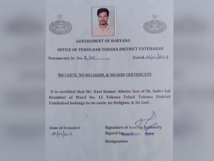 हरियाणाच्या टोहाना येथे राहणारा हा युवक यापुढे रवी नास्तिक म्हणून ओळखला जाणार आहे. रवीने नावात बदल करण्यासाठी 2017 मध्ये फतेहाबाद न्यायालयात दिवाणी खटला दाखल केला होता. त्याला यंदाच्या जानेवारीमध्ये नावासोबत नास्तिक लिहिण्याची अनुमती देण्यात आली. आता उप जिल्हाधिकाऱ्यांच्या आदेशानुसार तहसील कार्यालयाने रवी नास्तिकला 'नो कास्ट, नो रिलीजन आणि नो गॉड' प्रमाणपत्र दिले आहे.