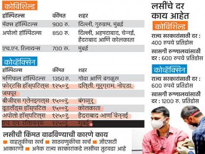 नवी दिल्ली : कोरोनावर प्रभावी ठरलेल्या कोविशिल्ड आणि कोव्हॅक्सिन या दोन लसीच्या किमती केंद्र सरकारने ठरवून दिल्या आहेत. त्यातही केंद्र सरकारच्या आरोग्य केंद्रावर लस घेतल्यास ४५ वर्षांपुढील नागरिकांना ती मोफत मिळेल, असे केंद्राने जाहीर केले आहे. किमतीच्या या घोळात खासगी रुग्णालयांनी मात्र लसीच्या किमती वाढविल्याचे निदर्शनास आले आहे.