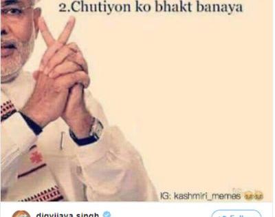 दिग्विजय सिंह यांनी जो फोटो शेअर केला आहे तो एक मेमे आहे. या फोटोसोबत लिहिण्यात आलं आहे की, 'माझ्या दोन मोठ्या उपलब्धी आहेत - पहिली म्हणजे भक्तांना चु** बनवलं आणि चु**ना भक्त बनवलं'. यासोबतच दिग्विजय सिंह यांनी ट्विटमध्ये लिहिलं आहे की, 'हा मेमे माझा नाही आहे, पण शेअर करण्यापासून स्वत:ला रोखू शकलो नाही. लोकांना मुर्ख बनवण्यात मोदी सर्वोत्तम आहेत'. दिग्विजय सिंह राज्यसभा खासदार असण्यासोबतच काँग्रेसचे सरचिटणीस आहेत.