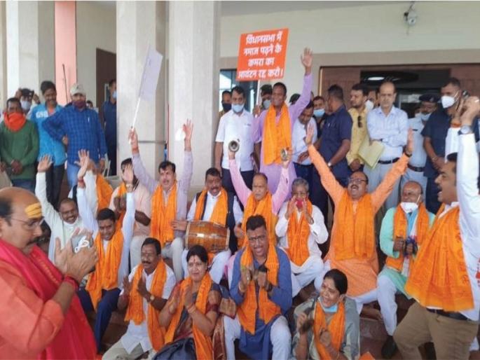 रांची: मंगळवारी झारखंड विधानसभेत नमाज अदा करण्यासाठी खोली वाटपाच्या मुद्द्यावर जोरदार निदर्शने झाली. भगव्या रंगाचे कपडे परिधान करून, जय श्री राम आणि हनुमान चालीसाचे पठण करत भारतीय जनता पक्षाच्या आमदारांनी अध्यक्षांच्या खुर्चीजवळ जाऊन सभागृहाच्या कामकाजात व्यत्यय आणला.