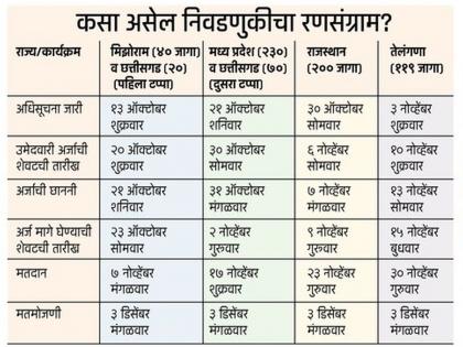 नवी दिल्ली : पुढील वर्षी होणाऱ्या लोकसभा निवडणुकीची रंगीत तालिम म्हणून ओळखल्या जाणाऱ्या पाच राज्यांच्या निवडणूका सोमवारी जाहीर झाल्या. देशात दिवाळी साजरी होत असताना, राजस्थान, मध्य प्रदेश, तेलंगणा, छत्तीसगड आणि मिझोरममध्ये मात्र राजकीय बार उडणार आहेत.
