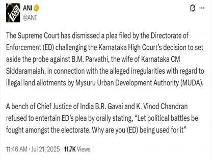 नवी दिल्ली - सुप्रीम कोर्टाने सोमवारी कर्नाटकातील एका प्रकरणावर ईडीला चांगलेच फटकारले आहे. ईडीचा कथित राजकीय वापर होण्यावरून कोर्टाने सुनावले. सुप्रीम कोर्टाने कर्नाटक मुख्यमंत्र्यांच्या पत्नीविरोधात दाखल केलेली ईडीची याचिका फेटाळली आहे आणि कर्नाटक उच्च न्यायालयाचा आदेश जैसे थे ठेवला. सरन्यायाधीश भूषण गवई यांच्या खंडपीठासमोर ही संपूर्ण सुनावणी झाली. त्यात सरन्यायाधीशांनी ईडीच्या वकिलांना फैलावर घेतले. या प्रकरणी न्याय दिल्याबद्दल कर्नाटकचे मुख्यमंत्री सिद्धरमैय्या यांनी अखेर न्याय झाला अशी प्रतिक्रिया दिली.