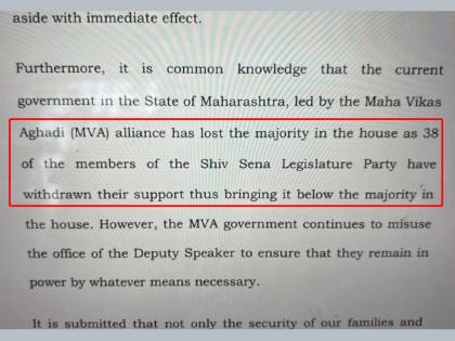 शिवसेनेकडून बंडखोरांवरील कारवाईसाठी विधानसभा अध्यक्षांकडे करण्यात आलेली तक्रार, अपात्रतेसाठी १६ आमदारांना आलेल्या नोटिसा याविरोधात शिंदे गटाने सुप्रिम कोर्टात याचिका दाखल केली होती. त्यानंतर या याचिकेमध्ये शिंदे गटाने आपल्याला शिवसेनेच्या ३८ हून अधिक आमदारांचा पाठिंबा असल्याचे म्हटले आहे. तसेच आपण सरकारचा पाठिंबा काढून घेत असल्याचे याचिकेत म्हटले आहे. शिंदे गटाकडे शिवसेनेच्या ३९ आणि इतर १२ अशा ५१ आमदारांचा पाठिंबा आहे.