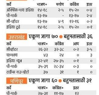 गोव्यामध्ये भाजप व काँग्रेसला कदाचित सारख्या जागा मिळून, तिथे त्रिशंकू विधानसभा अस्तित्वात येईल, असे म्हटले जात आहे. मणिपूर व उत्तराखंडमध्ये भाजप सत्तेवर येईल, असे पोल ऑफ पोल्सच्या निष्कर्षांतून सूचित होत आहे.