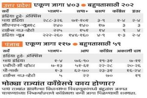 नवी दिल्ली : उत्तर प्रदेश, मणिपूर, उत्तराखंडमध्ये भाजपची सत्ता येणार असा निष्कर्ष बहुतांश जनमत चाचण्यांतून काढण्यात आला आहे. उत्तर प्रदेशात भाजपच्या सध्या असलेल्या ३०२ जागांमध्ये घट होऊन त्या पक्षाला २४० ते २६२ जागा मिळण्याची शक्यता आहे. उत्तर प्रदेशचा गड राखला जाणे हेच भाजपसाठी मोठे यश ठरणार आहे. त्या राज्यात भाजपला जोरदार टक्कर देणाऱ्या समाजवादी पक्षाला किमान १५० जागा मिळतील, असा अंदाज आहे. पंजाबमध्ये आप पक्ष सत्तेवर येण्याचा होरा जनमत चाचण्यांनी व्यक्त केला आहे.