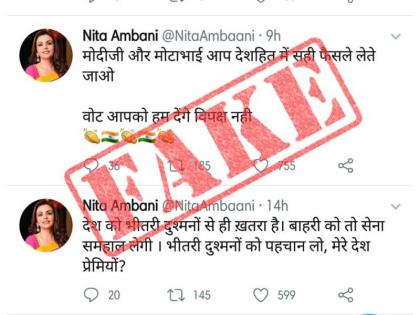 नीता अंबानींच्या नावानं व्हायरल झालेली ट्विट्स बोगस असल्याची माहिती रिलायन्सनं म्हटलं आहे. 'नीता अंबानी यांच्या कथित ट्विटर हँडलवरून अनेक बनावट ट्विट्स करण्यात आल्याचं आमच्या निदर्शनास आलं आहे. मात्र नीता अंबानी यांच्याकडे कोणतंही अधिकृत ट्विटर हँडल नाही. त्यांचं नाव किंवा छायाचित्रं असलेली सर्व ट्विटर खाती बनावट आहेत. कोणत्याही बनावट ट्विटर हँडलवरून जाणीवपूर्वक प्रसारित केल्या जाणाऱ्या ट्विट्सकडे कृपया दुर्लक्ष करावं. कथित ट्विटर हँडल निलंबित करण्यात आलेलं आहे', असं निवेदन रिलायन्स जिओ इन्फोकॉम लिमिटेडकडून प्रसिद्ध करण्यात आलं आहे.