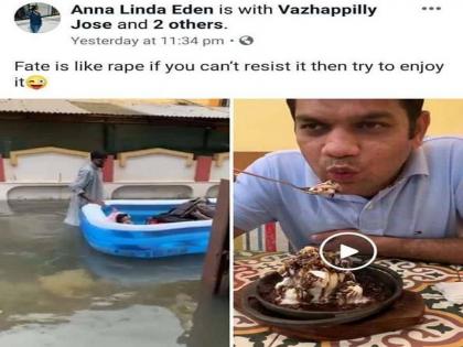मंगळवारी सकाळी अन्ना लिंडा एडन यांनी फेसबुकवर एक व्हिडीओ पोस्ट केला. यासोबत त्यांनी पती हिबी ईडन यांचा फोटोदेखील शेअर केला. 'नशीब बलात्कारासारखं असतं. त्याला रोखू शकत नसाल, तर त्याचा आनंद घ्या,' असं शीर्षक त्यांनी फोटो आणि व्हिडीओला दिलं होतं. सध्या कोच्चीमध्ये मुसळधार पाऊस सुरू आहे. त्यामुळे कोच्ची शहराचा बराचसा भाग पाण्याखाली आहे. अन्ना एडन यांची पोस्ट पावसाशी संबंधित असल्याचं अनेकांना वाटत आहे. एडन यांनी शेअर केलेला एक फोटो कोच्चीतील पूर परिस्थिती दाखवणारा आहे. एडन यांनी फोटो पोस्ट करून कोच्चीतील पुराचा खिल्ली उडवल्याचा आरोप होत आहे.