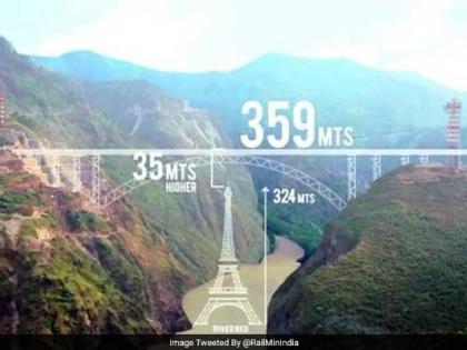 नवी दिल्ली - आयफेल टॉवरपेक्षाा ३५ मीटर उंच आणि जगातील सर्वात उंच रेल्वे ब्रिज जम्मू काश्मीरमध्ये बांधून तयार झाला आहे. या ब्रिजचे बांधकाम गेल्या तीन वर्षांपासून सुरू होते. आता हा ब्रिज जवळपास बांधून तयार झाला आहे. आता रेल्वेमंत्री पीयूष गोयल यांनी या ब्रिजचे फोटे शेअर करून ही खूशखबर दिली आहे.