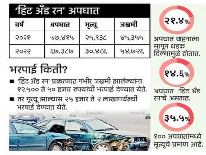 ‘हिट अँड रन’ने २०२१ मुळे ५७,४१५ अपघात झाले असून यात २५ हजार ९३८ मृत्यू तर ४५ हजार ३५५ जण जखमी झाले आहेत. २०२२ मध्ये ‘हिट अँड रन’मुळे ६७,३८३ अपघात झाले आहेत. २०२२ मध्ये ‘हिट अँड रन’मुळे अपघात १७.४%ने वाढले आहेत.