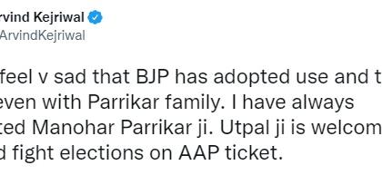 भाजपने वापरा आणि फेकून द्या या धोरणानुसार पर्रिकर कुटुंबीयांचा वापर केला, गोव्यातील लोकांनाही याचे दु:ख आहे. मी नेहमीच मनोहर पर्रिकर यांचा आदर करतो. उत्पल यांचं आम आदमी पक्षात स्वागत आहे, त्यांनी आपच्या तिकीटावर गोव्यातून निवडणूक लढवावी, असे ट्विट अरविंद केजरीवाल यांनी केलय