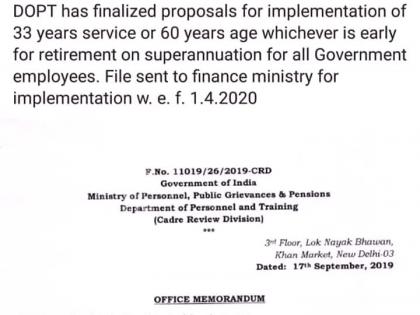 नवी दिल्ली : केंद्र सरकारनेसरकारी कर्मचाऱ्यांच्या निवृत्तीचा मोठा निर्णय घेतला असून सेवा 33 वर्षे किंवा वयाची 60 वर्षे पूर्ण झालेली असल्यास 1 एप्रिल 2020 पासून सक्तीची निवृत्ती घेण्यास भाग पाडणार आहे. याबाबतचे मॅसेज, स्क्रीनशॉट सोशल मिडीयातून पसरत आहेत. यामुळे सरकारी कर्मचाऱ्यांमध्ये खळबळ उडाली आहे.