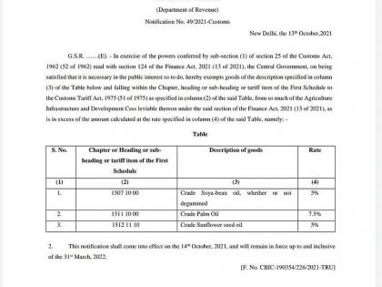 सरकारनं जारी केलेल्या नोटिफिकेशनुसार, खाद्यतेलावरील कस्टम ड्युटीत कपात करण्यात आली आहे. याशिवाय कृषी सेसही कमी करण्यात आला आहे. कच्च्या पाम तेलावर आता ७.५ टक्के कृषी सेस असणार आहे. तर कच्च्या सोयाबीन तेल आणि सुर्यफूल तेलावर हाच दर ५ टक्के इतके असणार आहे.