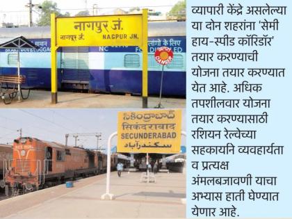 नवी दिल्ली, दि. 10 - नागपूर-हैदराबाद ही दोन महत्त्वाची शहरं. एक महाराष्ट्राची उपराजधानी तर दुसरी तेलंगणची राजधानी. व्यापारी दृष्ट्या अत्यंत महत्त्वाच्या शहरातील रेल्वे प्रवासासाठी सध्या तब्बल नऊ तास प्रवास करावा लागतो. मात्र आता या दोन शहरांमध्ये सेमी-हायस्पीड रेल्वे सुरू करण्याचा सरकारचा विचार असून, ही योजना प्रत्यक्षात आल्यास हा प्रवास केवळ तीन तासांमध्ये होणार आहे. रेल्वेच्या एका वरिष्ठ अधिकाºयाने सांगितले की, रशियन रेल्वेच्या साह्याने या योजनेची व्यवहार्यता तपासण्यात येत आहे. त्यानंतर अंमलबजावणीच्या मंजुरीसाठी ही योजना रेल्वे बोर्डाकडे पाठवण्यात येणार आहे.