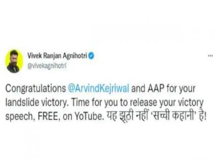 विवेक अग्निहोत्रीने एक व्हिडिओ क्लिप ट्विट करून लिहिले, ''विजयासाठी अरविंद केजरीवाल यांचे अभिनंदन. आता तुम्ही तुमचे विजयी भाषण YouTube वर विनामूल्य रिलीज करण्याची हीच वेळ आहे. ही खोटी नसून 'सत्यकथा' आहे.'' दरम्यान, द काश्मीर फाइल्स चित्रपट प्रदर्शित झाल्यानंतर अरविंद केजरीवाल यांच्या एका वक्तव्याची खूप चर्चा झाली होती. अनेक राज्यांमध्ये हा चित्रपट करमुक्त करण्यात आला होता. यावरुन केजरीवाल म्हणाले होते की, ''चित्रपट दिग्दर्शक करोडोंची कमाई करत आहेत. सगळ्यांना चित्रपट दाखवायचाच असेल तर तो यूट्यूबवर फ्रीमध्ये टाकायला सांगा. करमुक्त करण्याची काय गरज आहे?''