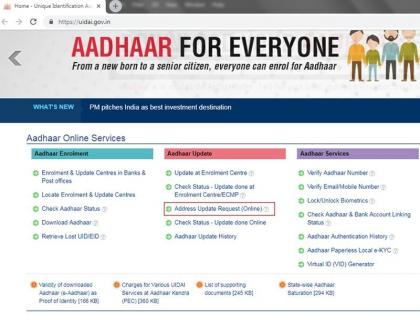 1. UIDAIच्या https://uidai.gov.in/ या वेबसाइटवर जावं लागेल. तेथे Aadhaar Online Services या पर्यायावर क्लिक करुन Aadhaar Update सेक्शनमध्ये जावं लागेल आणि मग Address Update Request (Online) वर क्लिक करावे.