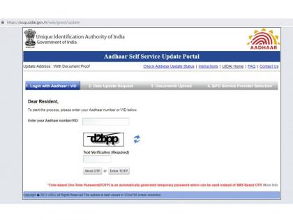 3. यानंतर अपडेट अॅड्रेसच्या पर्यायावर क्लिक करा आणि आपला आधार कार्ड क्रमांकाद्वारे लॉगिन करा. आता तुमच्या मोबाइलवर एक ओटीपी (वन टाइम पासवर्ड) येईल.
