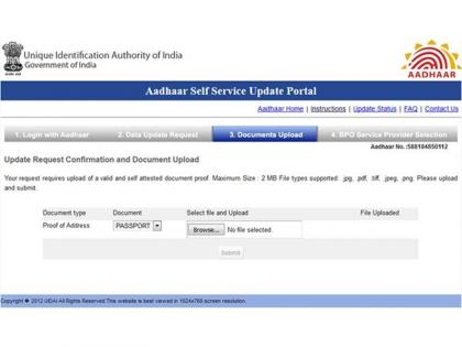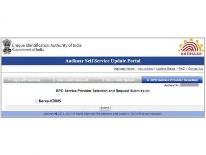 6. यानंतर बीपीओ सर्विस प्रोव्हायडर निवडा आणि रिक्वेस्ट सबमिट पर्यायावर क्लिक करा. आता तुम्हाला एक अपडेट रिक्वेस्ट क्रमांक प्राप्त होईल. या क्रमांकाच्या मदतीनं रिक्वेस्टची एक्नॉलेजमेंट कॉपी डाऊनलोड करा आणि प्रिंट घ्या. रिक्वेस्ट सबमिट केल्यानंतर काही दिवसांनंतर तुमचा नवीन पत्ता आधार कार्डवर अपडेट होईल आणि ई-मेल किंवा मोबाइलवर याची तुम्हाला माहिती पुरवण्यात येईल.
